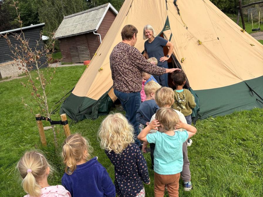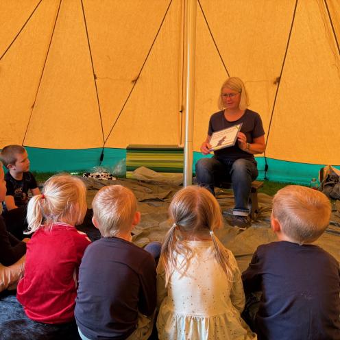 Her i august tager børnebibliotekarerne ud til nogle af kommunens daginstitutioner med vores flotte Laavu-telt, som egner sig rigtig godt som fortælletelt.